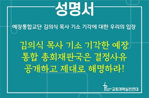 예장통합교단 총회 재판국이 2025년 2월 11일, 김의식 목사를 상대로 제기된 '영등포노회 김의식 목사 불기소 처분에 대한 재항고 사건'에 대해 “김 목사에 대한 기소명령을 하지 않는다”고 결정한 것에 항의해 교회개혁실천연대(공동대표: 남오성∙임왕성∙김종미)가 성명서를 발표했다.